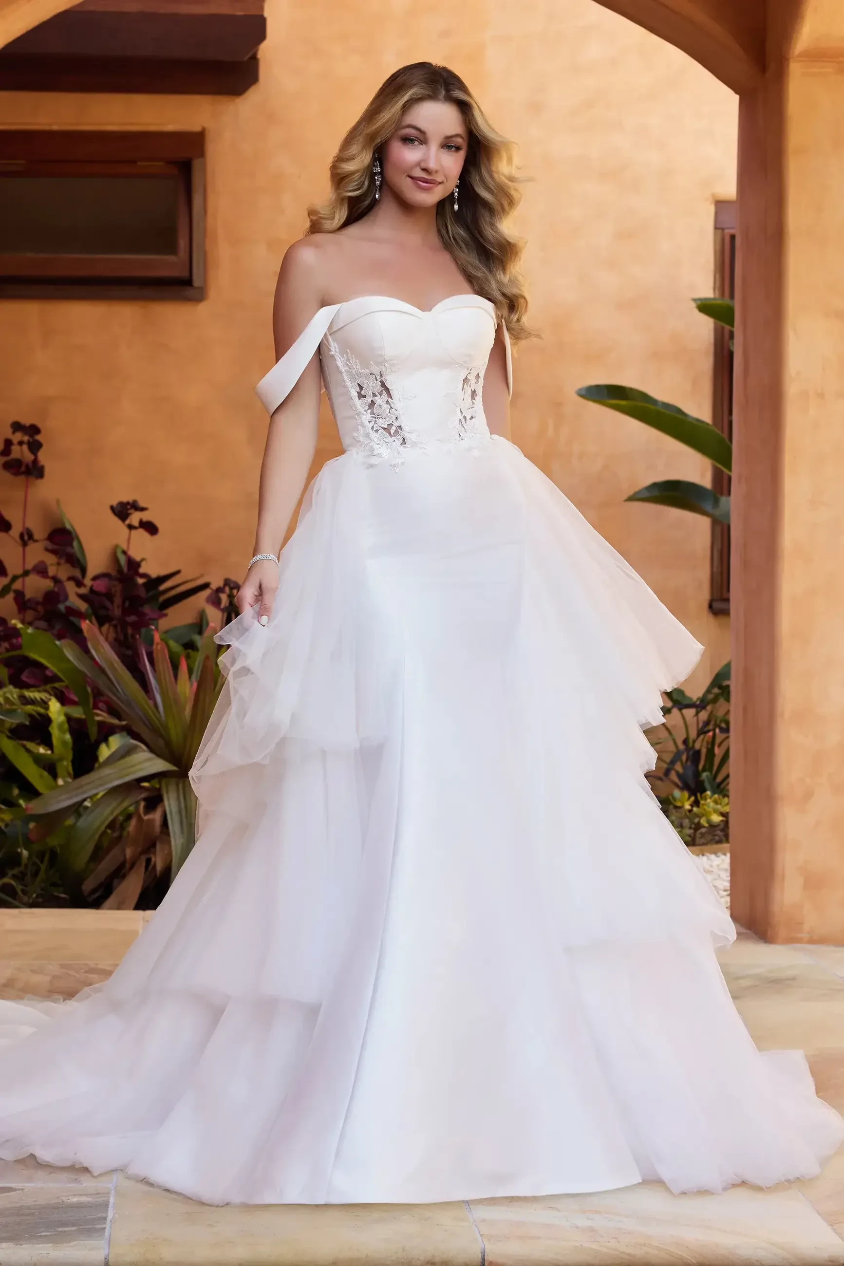 A timeless option, the tulle overskirt adds an ethereal touch to any gown. Whether you opt for delicate lace or intricate beadwork, the tulle overlay provides a soft, romantic look that floats gracefully with every step.