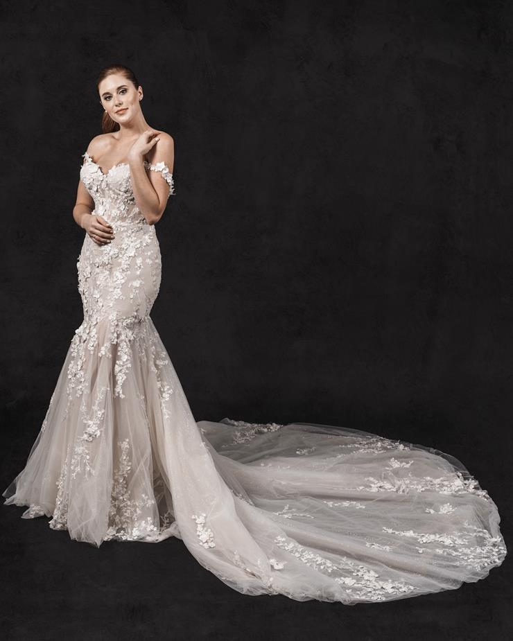 If you’re dreaming of intricate, ethereal elegance, you’ll love this gorgeous mermaid dress detailed all over with carefully placed floral applique. The applique adds a breathtaking texture, with the florals cascading romantically down the gown and detailing the hem of the train for a look with endless intricacy. Thin, delicate off-the-shoulder straps add to the romantic look, while the structured corset bodice perfectly pairs with the dramatic, chapel-length train.