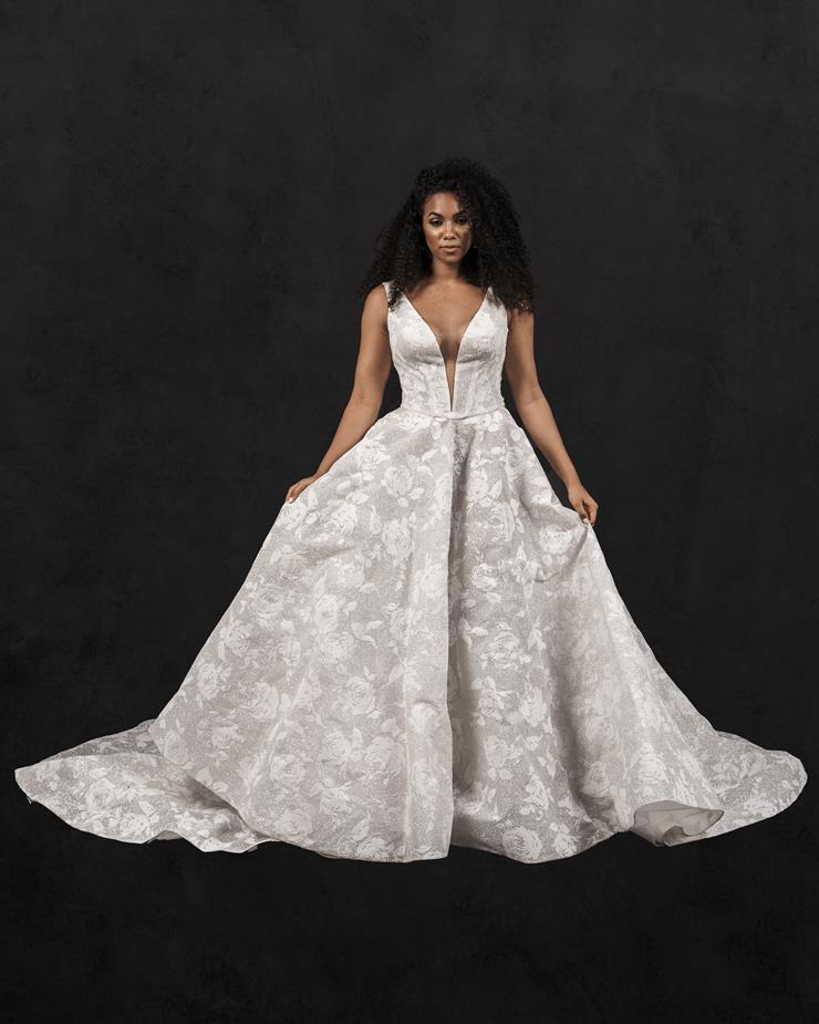 This jaw-dropping ball gown is perfect for the bride who wants to feel like a princess on her wedding day. Covered in oversized, bold floral blooms, this ball gown is perfect for the regal bride who wants the drama of a ball gown without the shimmer. The flowers add to the regal look, while the plunging neckline gives the ball gown a sultry drama that pulls the silhouette into the modern age.