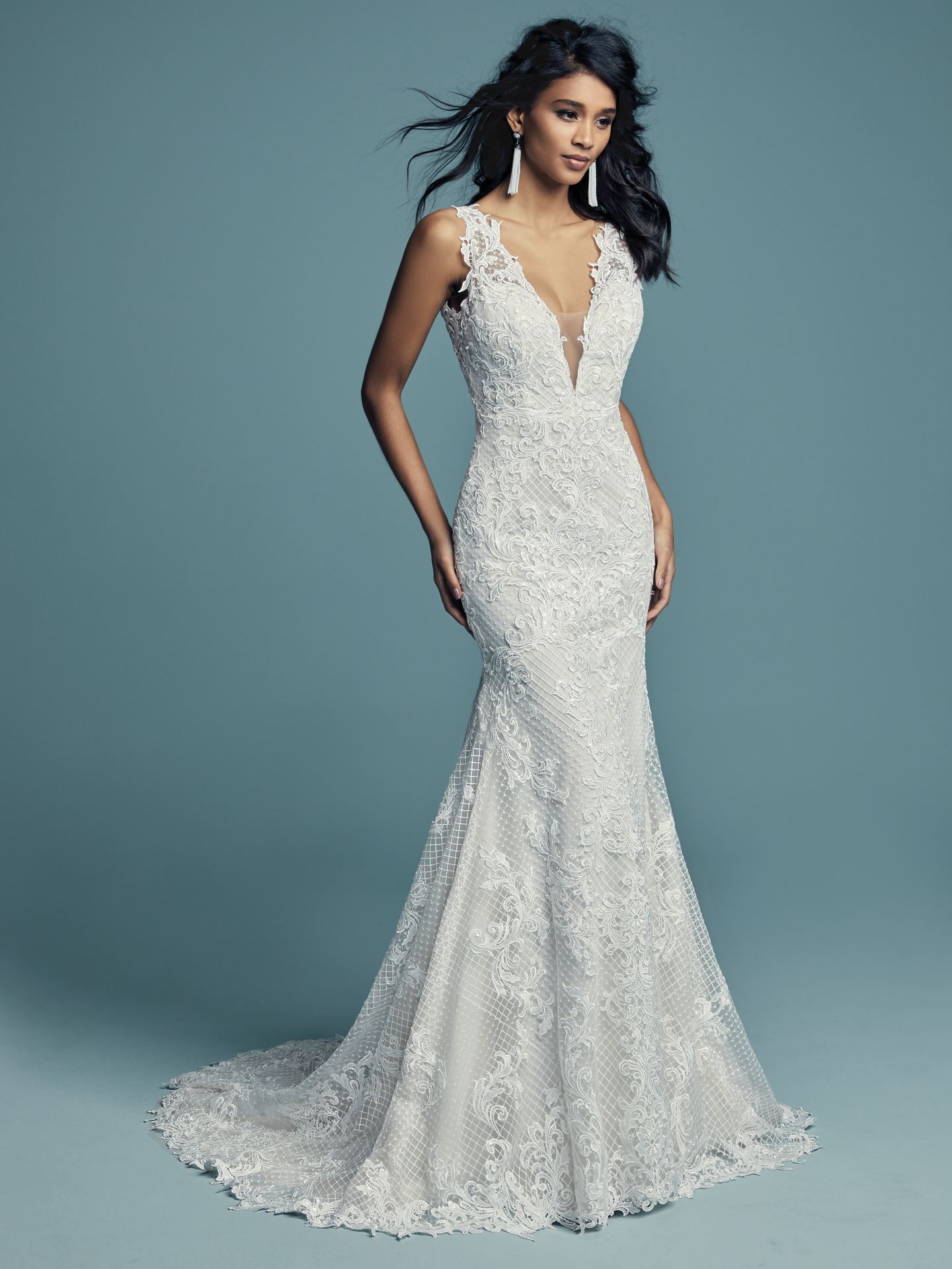 Work with angles: a unique neckline, swirls of beading and embellishment, and a tiered skirt add visual interest to your gown.