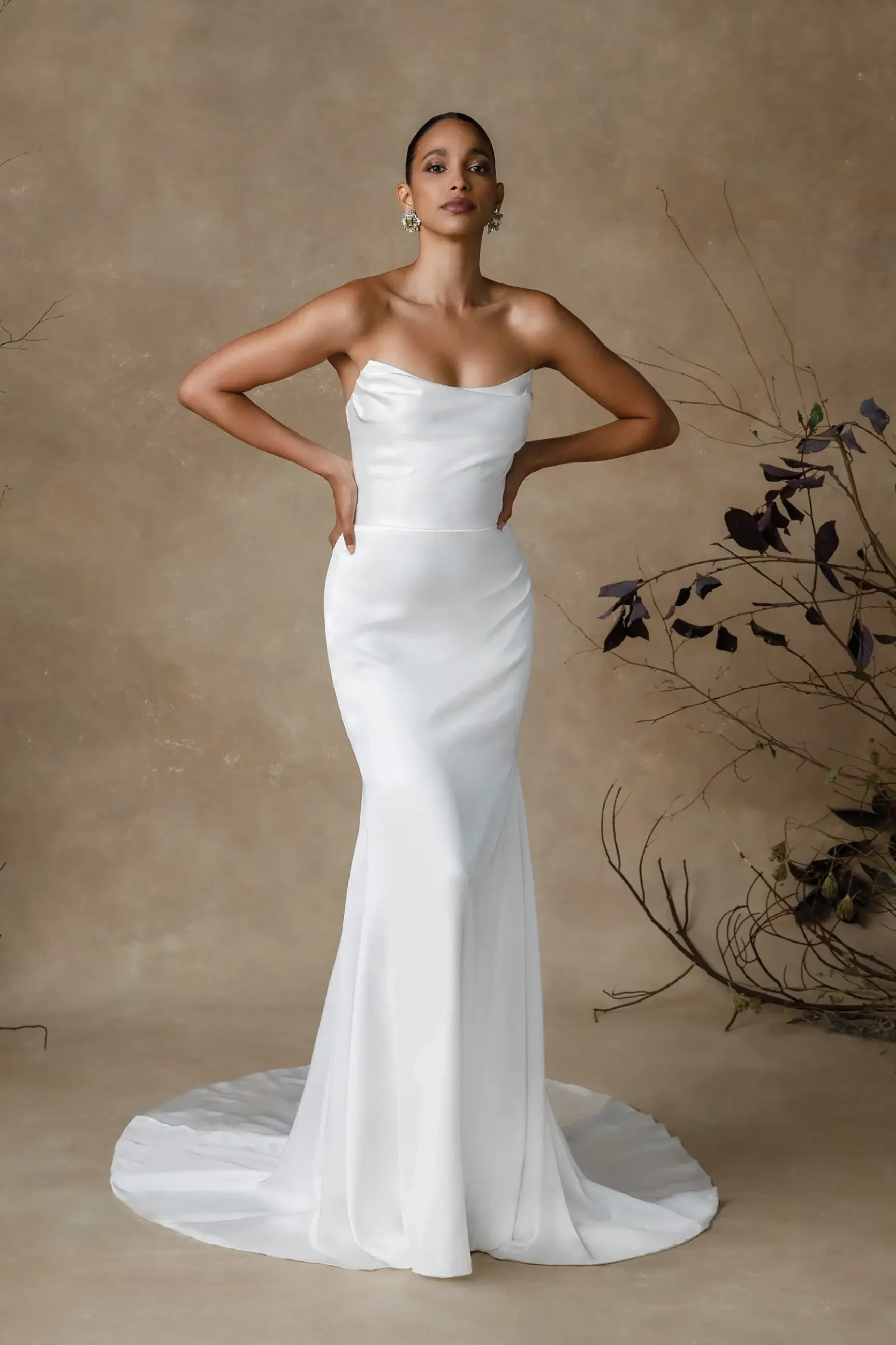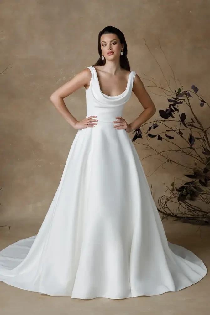 Silk Crepe – Smooth, sleek, and oh-so-breathable, silk crepe hugs the body while keeping things lightweight. Perfect for brides who want a modern, minimalist look!