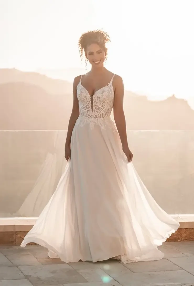 Chiffon – This dreamy, lightweight fabric flows effortlessly, making it perfect for beach or outdoor weddings. It drapes beautifully without feeling heavy, so you can move with ease while staying breezy.