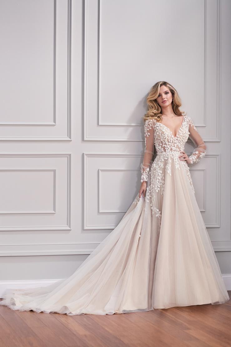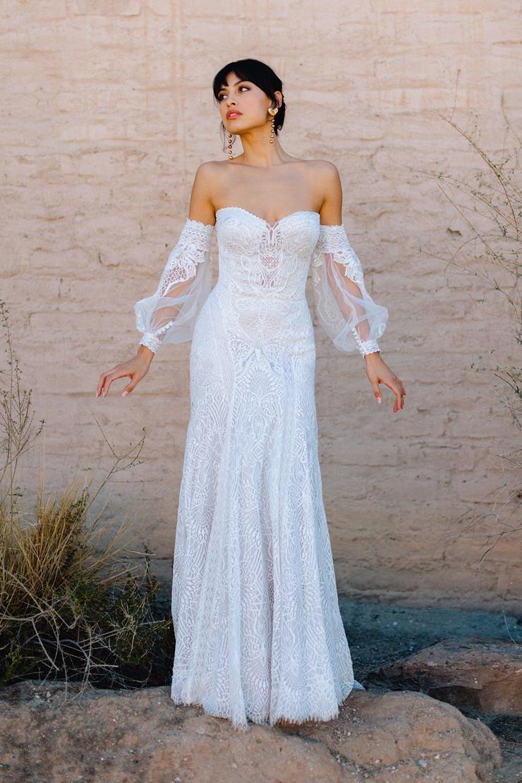 Modern and unique, this dress features off-the-shoulder bishop sleeves. Delicate non-traditional lace covers the gown, giving it all-over intricacy while the unique style of the sleeves creates a completely unexpected look. If you’re dreaming of modern romance, this is it.