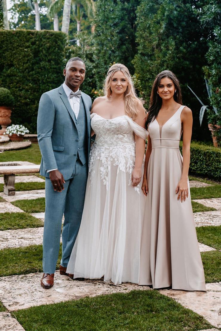 This gorgeous A-line has the ethereal romance you’re looking for. With sheer, delicate tulle off-the-shoulder straps and a flowing, translucent skirt, this dress is boho and dreamy. Floral applique details add a nature-inspired beauty, creating an intricate, breathtaking wedding dress.