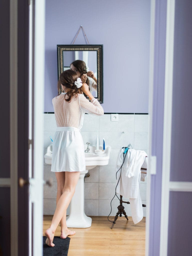 Once you’re ready to visit your bridal shops, wear something comfortable but dress it up a bit—freshen up your makeup, treat yourself to a manicure, etc. You’ll feel more confident if you do, and it helps the consultant get a better sense of your style. Don’t forget to take a pair of heels that match the height you plan on wearing on your wedding day. And remember to eat and stay hydrated so your focus stays on finding your perfect wedding dress!