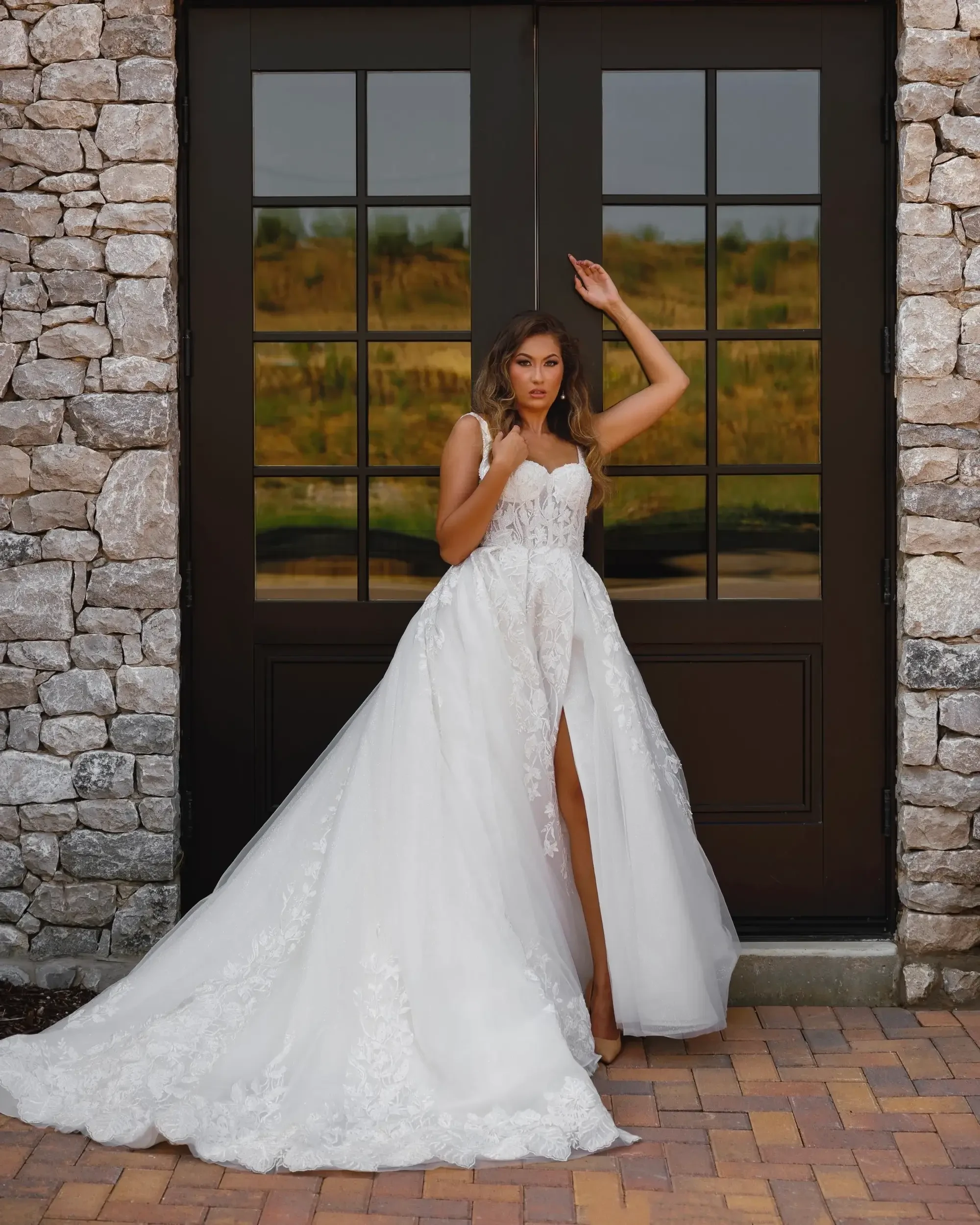 High slits are not just for evening gowns anymore. Bridal dresses with daring slits are making waves, adding a hint of sultry sophistication. Whether you choose a thigh-high slit or a more modest version, this trend is perfect for brides who want to combine elegance with a touch of allure.