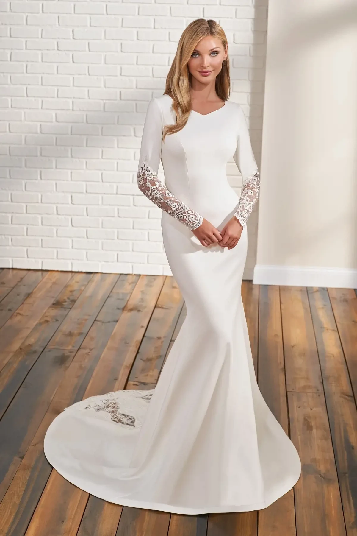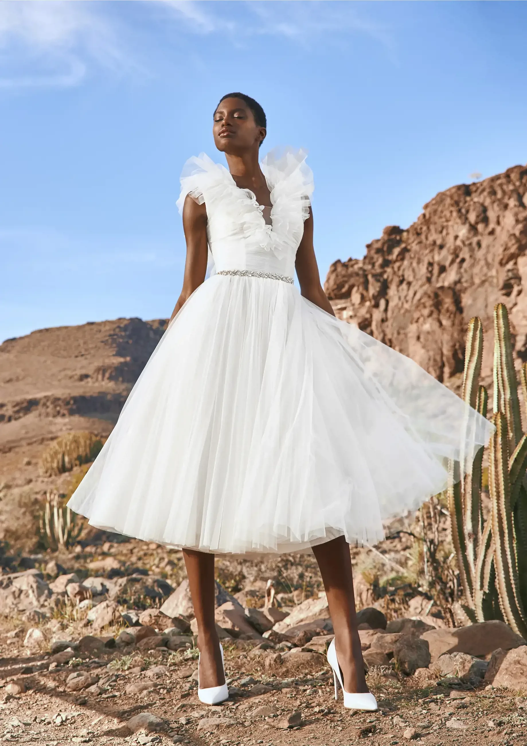 A classic, stark white gown is the best option for brides seeking the whitest gown possible. Choosing a classic white gown is great because you can find a wide variety of styles and silhouettes to choose from! Certain skin tones look better with them because they almost have a blue undertone. The white can almost glow on darker skin! As far as bridal fashion is concerned, a classic white gown will never go out of style.